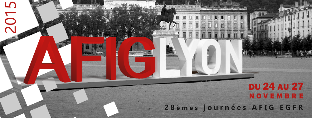 sur le site Web des 28èmes journées de l’Association Française en Informatique Graphique, du Chapitre Français d’Eurographics, du Groupement de Recherche Informatique Géométrique et Graphique, Réalité Virtuelle et Visualisation (GDR IG-RV) et des journées des Groupes de Travail en Modélisation Géométrique (GT MG), en Rendu (GT Rendu), en Animation et Simulation (GT AS) et en Géométrie Discrète (GT GeoDis) qui auront lieu à Lyon du mardi 24 au vendredi 27 Novembre 2015. Cette année, l’AFIG sera co-localisé avec la journée de travail du groupe de Géométrie Discrète (GT GeoDis).